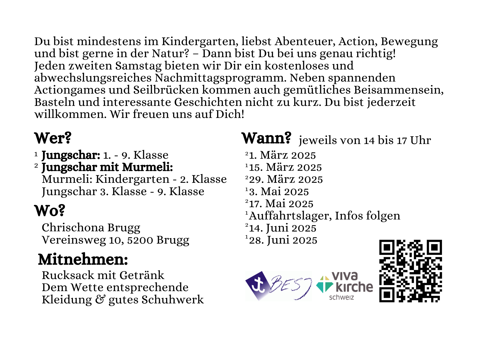 Die Jungschi ist Teil der Jugendarbeit, die zur Chrischona-Gemeinde Brugg gehört. Sie ist dem Bund Evangelischer Schweizer Jungscharen (BESJ) angeschlossen. (Auf diesem Merkblatt erfährst du mehr über den BESJ)